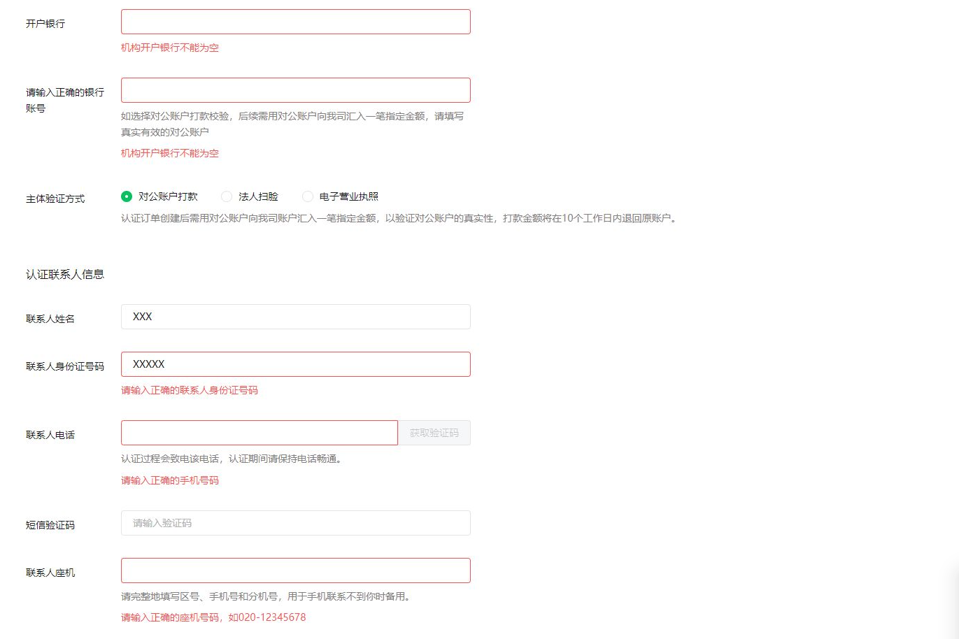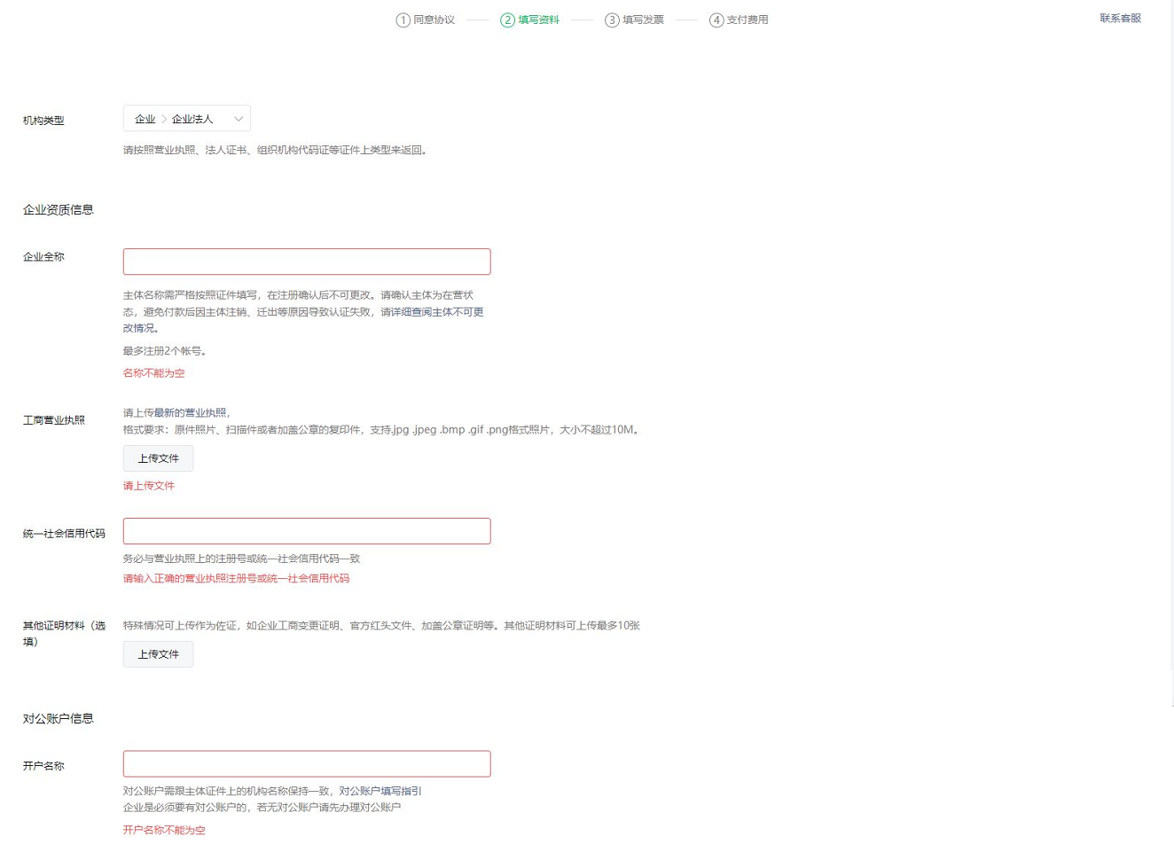 选择完类型后进入填写认证资料页面,各类型需要提交的资质材料包括但不限于: