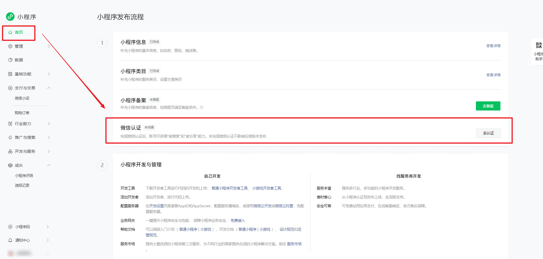入口二:登录到微信公众平台(mp.weixin.qq.com)小程序管理后台首页--小程序认证中操作