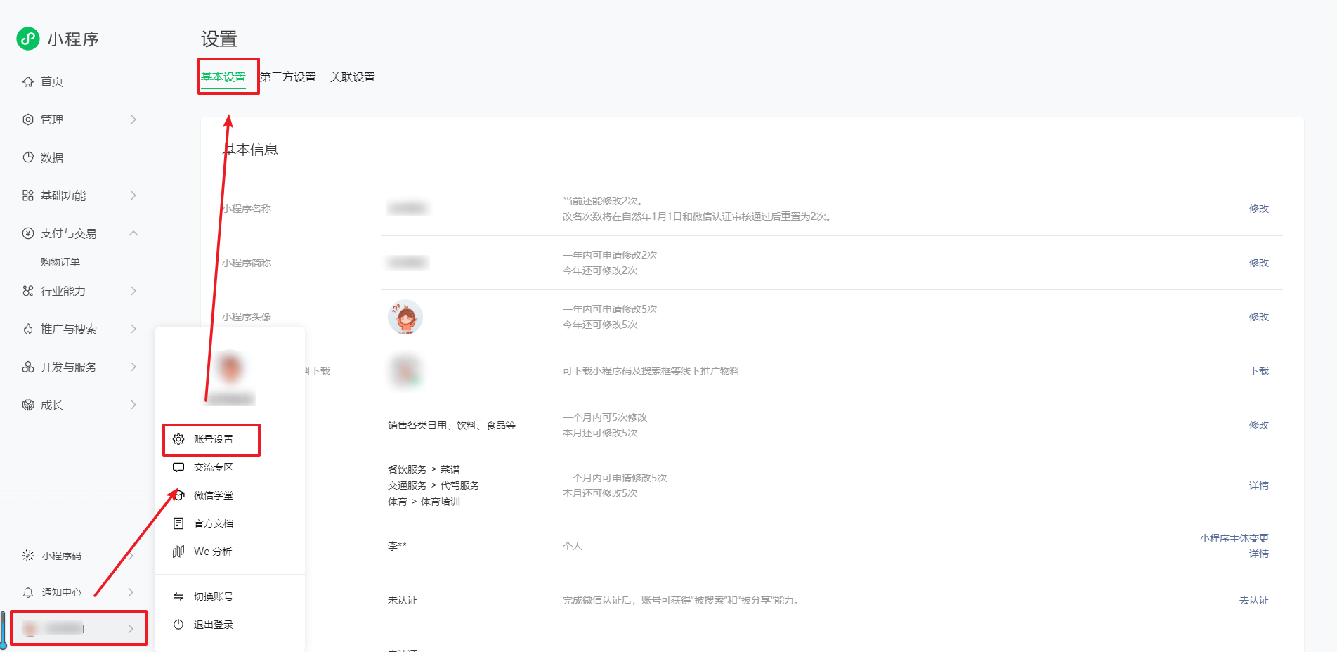 入口一:登录到微信公众平台(mp.weixin.qq.com)-小程序管理后台--基本设置操作。