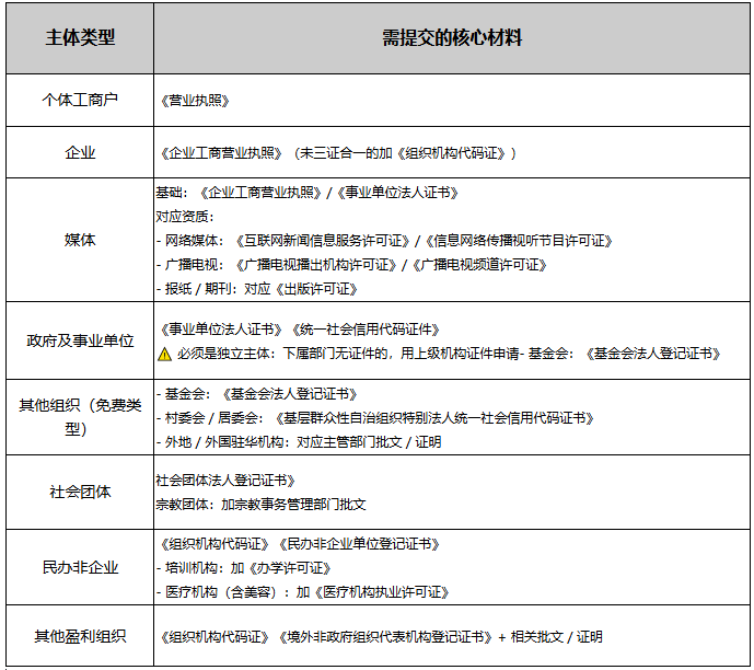 (所有材料要求:三证合一的传最新主体证件;需原件照片 / 扫描件 / 加盖公章的复印件)