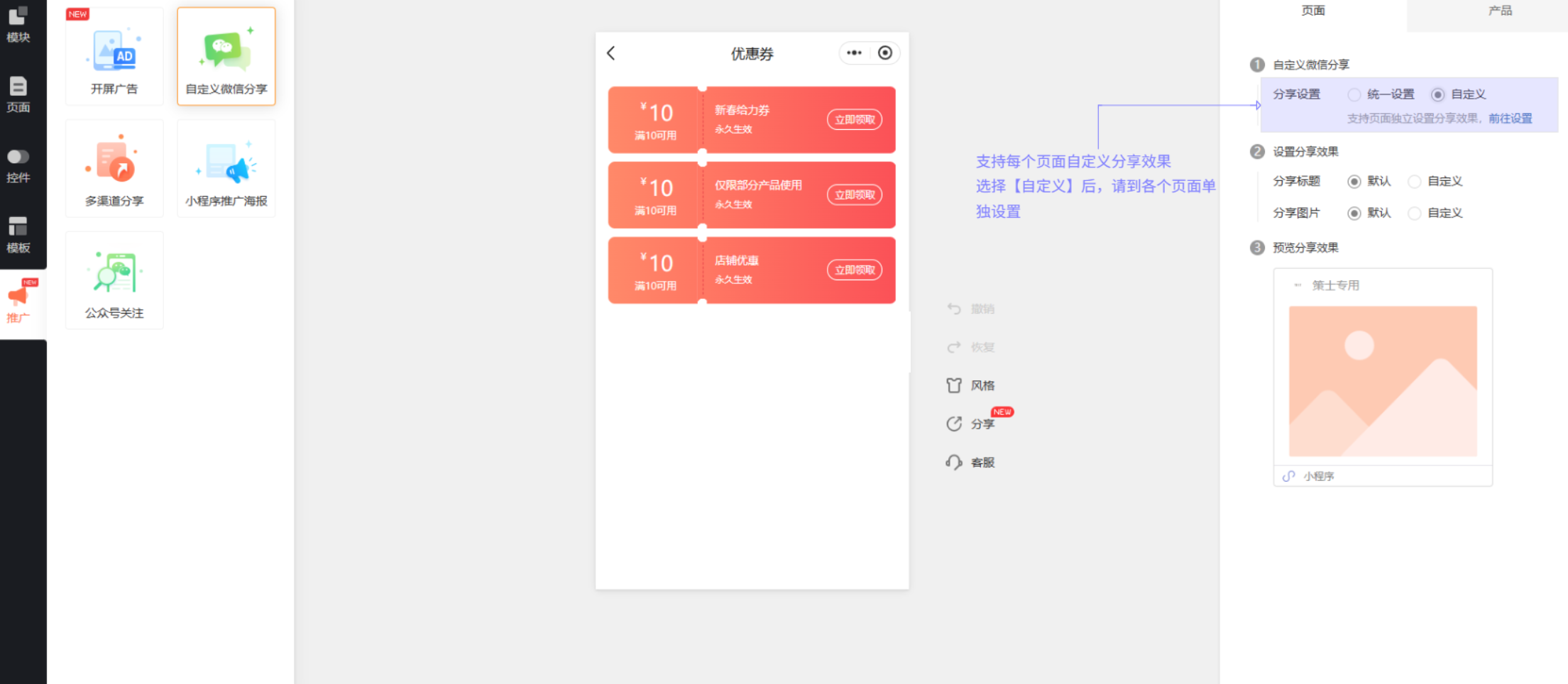 1. 小程序装修-推广:先在此处设置分享样式类型